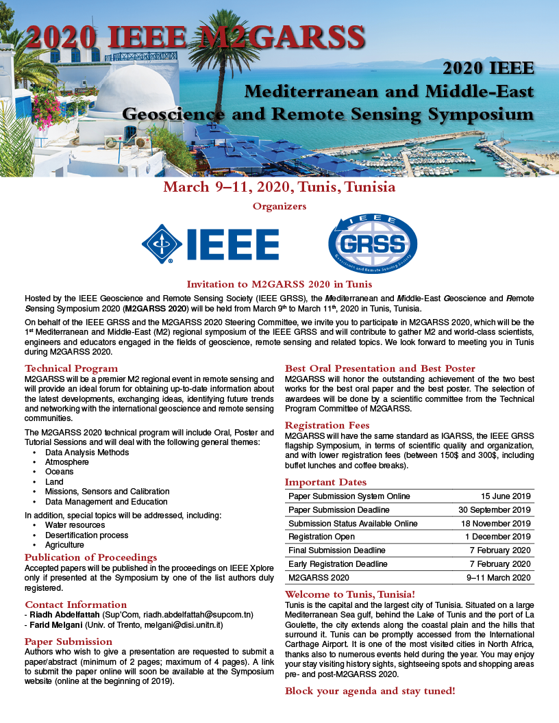 Hosted by the IEEE Geoscience and Remote Sensing Society (IEEE GRSS), the Mediterranean and Middle-East Geoscience and Remote Sensing Symposium 2020 (M2GARSS 2020) will be held from March 9th to March 11th, 2020 in Tunis, Tunisia.